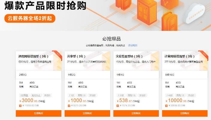 2核8G5M带宽 通用网络增强型云服务器3000/3年起,1核2G1M带宽共享型云服务器1000/3年起,1核1G1M带宽突发性能型t5云服务器538.87/3年起,8核16G8M带宽计算网络增强型云服务器10000/3年起。